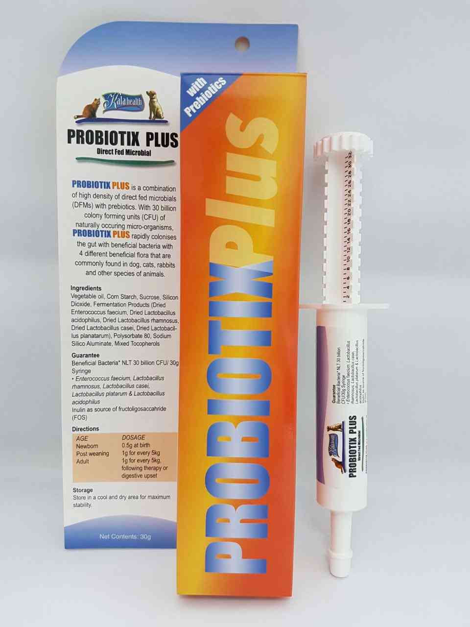 Probiotix plus is a combination of high density of direct fed microbials (DFMs) with prebiotics. With 15 billion colony forming units (CFU) of naturally occurring micro-organisms. Probiotix Plus rapidly colonise the gut with the beneficial bacteria flora that are commonly found in dog, cats, rabbits and other species of animals.