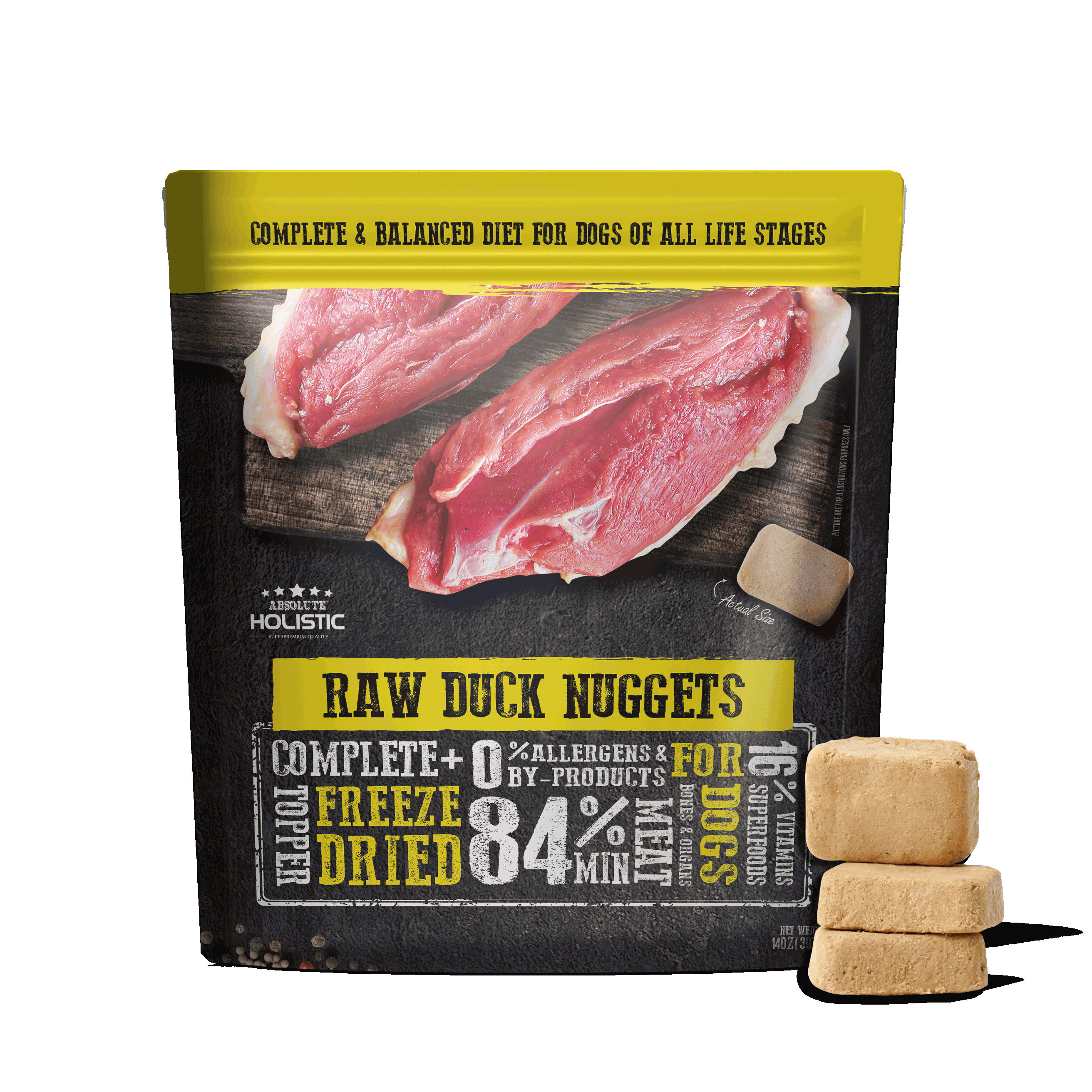 Absolute Holistic® Raw Duck Nuggets offers your beloved pet a complete and balanced freeze-dried raw diet made with premium cuts of real duck and nutrient-rich vegetables. With a naturally high meat content and absolutely no grains, fillers, or artificial additives, every delicious bite delivers the natural goodness your pet truly craves. Crafted carefully to mirror a biologically appropriate, ancestral diet, our recipe is gently freeze-dried to preserve the raw nutrition, natural flavor, and essential nutrients without the need for refrigeration. This meticulous process ensures your pet gets the full benefits of raw feeding in a convenient, shelf-stable format. Each nutrient-dense nugget is packed with high-quality protein to help support strong muscles, healthy energy levels, and overall vitality. Added wholesome fruits and vegetables provide natural fiber to aid digestion, while essential nutrients help maintain a healthy immune system and a soft, shiny coat. Ideal for dogs and cats of all breeds and life stages, raw in the bag is perfect as a complete meal or a protein-packed meal topper. Pure. Raw. Wholesome. Give your pet the nutrition nature intended.
