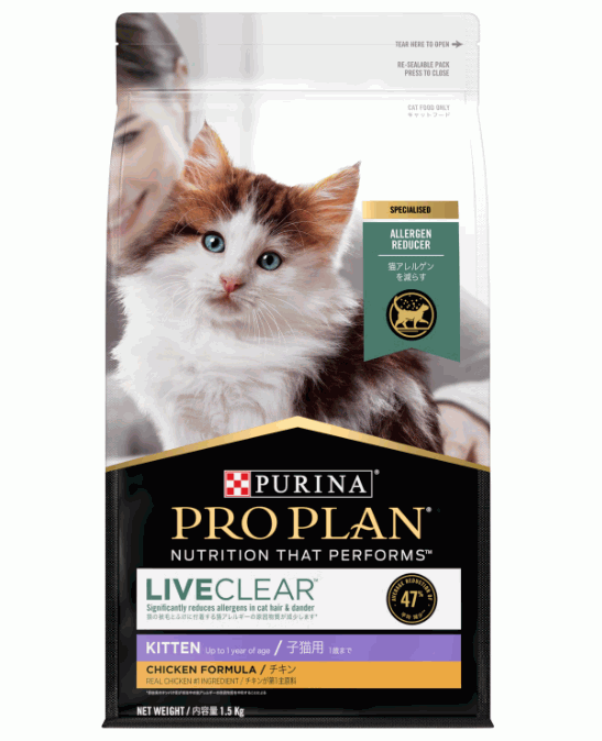 Purina Pro Plan LiveClear is the first-of-its-kind cat food shown to reduce the major allergen in cat hair and PRO PLAN® LIVECLEAR™ KITTEN , CHICKEN FORMULA has great-tasting, outstanding nutrition in an everyday food with the power to reduce allergens in cat hair and dander