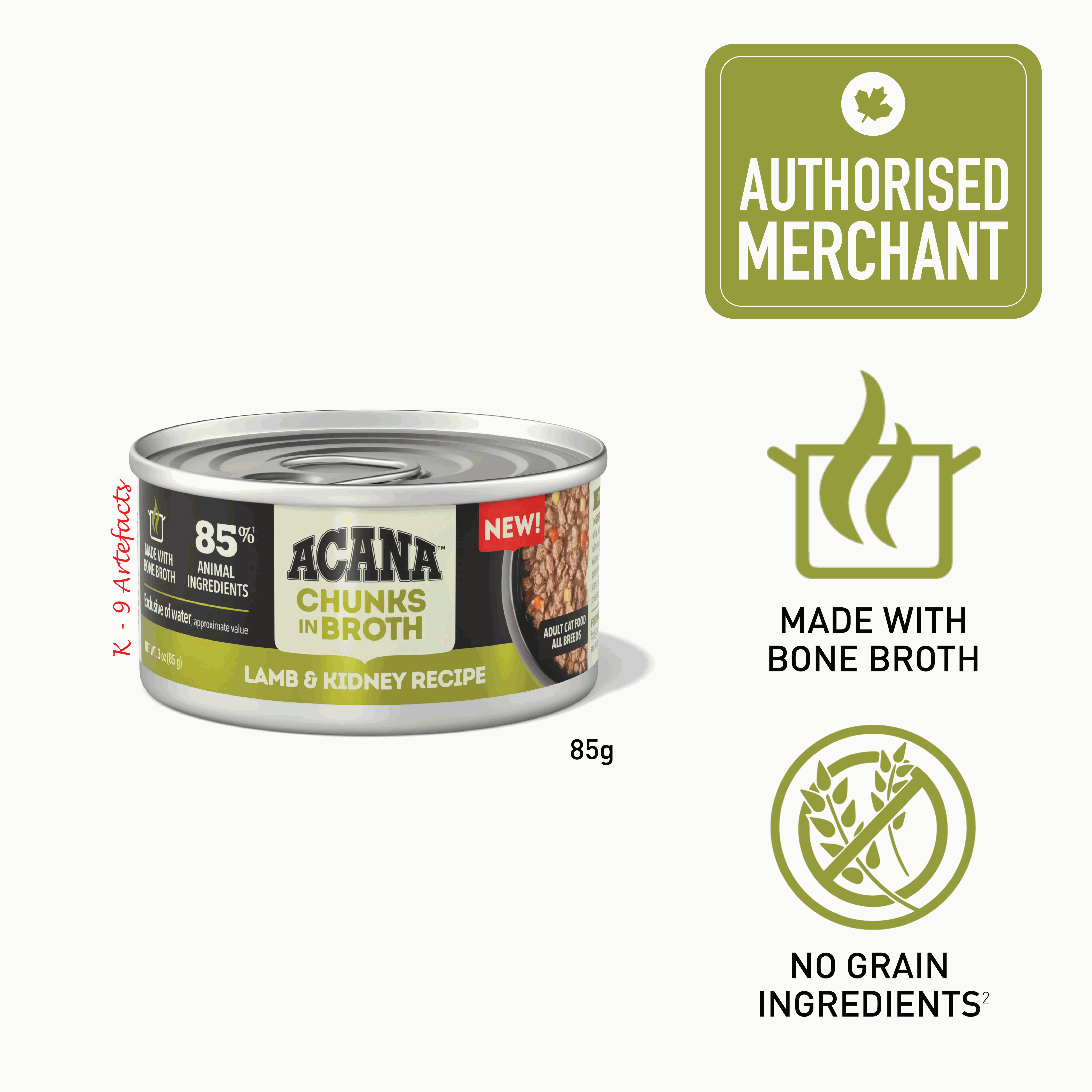 Nurture your cat with the protein-rich animal ingredients and delicious bone broth in ACANA Chunks in Broth wet cat food! Crafted with 85% animal ingredients1, our Lamb & Kidney Recipe provides your cat with the nourishing animal protein they crave. Each can features nourishing animal ingredients, including savoury lamb and kidney, in satisfying chunks. It also includes hydrating beef, chicken and turkey broths to tantalize your cats tastebuds and provide them with the moisture they need. This recipe also helps support your cats immune health and skin & coat health. Nurture your cat with a wet cat food that helps them feel so good inside, youll see it on the outside! The first 6 ingredients in this recipe are animal ingredients, including protein-rich lamb and kidney. Contains no grain ingredients2, carrageenan, pea, lentil or legume ingredients. Has a delicious and hydrating bone broth cats love. Naturally occurring Omega-6 and Omega-3 fatty acids help support healthy skin & coat. Antioxidant-rich ingredients plus added vitamin E help support your cats immune health. 1Exclusive of water; approximate value.2Produced in a facility that also processes grains.